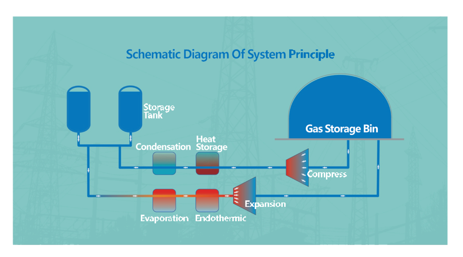 The new CO2 compression energy storage system is a gas-liquid mutual conversion, two-phase collaborative energy storage technology. It is discard of geological conditions and operates at low pressure and temperature levels, offering high reliability and cost-effectiveness. The basic principle involves utilizing surplus power during periods of low electricity consumption to compress CO2 gas at normal temperature and pressure into a liquid phase. This process stores the heat energy generated during compression. During peak periods of electricity consumption, the stored heat energy is utilized to heat the liquid carbon dioxide, converting it back to a gaseous phase. This gas drives turbine to generate electricity.
